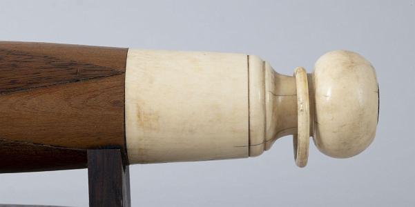 InformationWhale Ivory and exotic wood scrimshaw rolling pin, American circa mid-19th Century. The opposite end of the rolling pin are made from whale ivory the are 2 3/8 inches in length. The ends of these sections are bulbous in form with inlaid tortoise shell inlays at the back ends. The inside of the ivory ends have perfectly rounded ivory rings that float and turn freely around a narrow part of the handle end. These rings are sometimes referred to as mystery rings because it is difficult to understand how they were placed there. We have never seen mystery rings created for a rolling pin before. There is a 6 5/8th inches section of exotic wood cut in full length diamond fallowed by opposing lighter colored wood triangles. There are four of each type of section going around the circumference of the rolling pin. (SC1215)