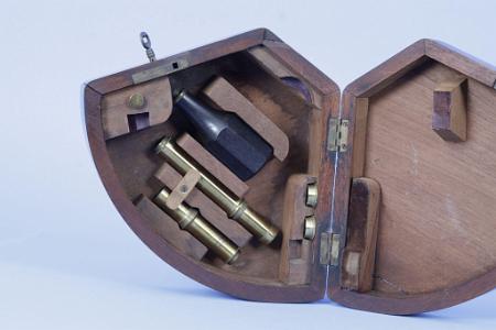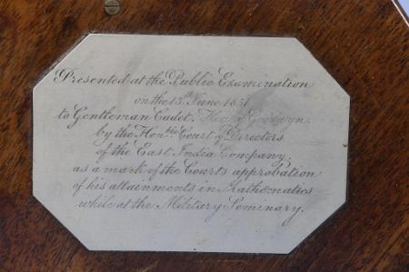 Information RARE HISTORIC MINIATURE SEXTANT. A fine, mid-1800s presentation sextant signed on the large arc in perfect hand-engraved script, “Troughton & Simms, London.” Of all brass construction with a V-shaped frame, the sextant has an inlaid silver arc reading from -5 to 160 degrees, effectively making it a quintant. Incredibly, these divisions along with the vernier scale on the index arm, allow this sextant to match the accuracy of it larger cousins, down to 20 arc seconds! A pivoting magnifier is provided for taking the reading. The index arm has a miniaturized version of a thumb screw stop and tangential fine adjust. The sextant is complete with its 2 horizon filters and 2 index filters in perfect condition. The index mirror and horizon mirror are in beautiful condition. The whole presentation is totally complete in its shaped rich mahogany box. The octagonal ebony handle screws into the frame with a secure fit. There are two optics, a peep and a telescope which fit into the height-adjustable sight holder. Rounding out the accessories, there are both sight tube filters, mirror adjustment tool, and the functional skeleton key for the cases brass lock. Of special interest the hand-engraved presentation on sterling silver inlaid plaque on the top of the box. It reads, “Presented at the Public Examination on the 13th of June 1851 to Gentleman Cadet, Henry Goodwyn by the Honble Court of Directors of the East India Company, as a mark of the Courts approbation of his attainments in Mathematics while at the Military Seminary.” (I 0993))