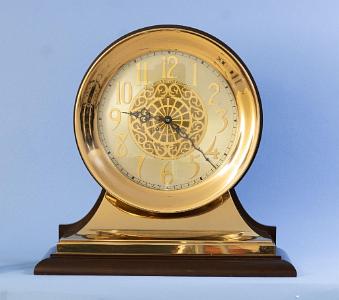 The movement is of excellent quality. It is spring wound and is designed to run for eight days and to strike on the hour and half hour in a nautical time sequence. This means that at 12:30, this clock will strike once. At 1:00, the movement will strike twice, and at each half-hour interval until 4:00, it will strike an additional blow. At 4:00, This clock will strike a total of 8 times. At 8:30, this sequence will then repeat itself by starting over. The escapement features a balance wheel. This allows this clock to be used in environments that are not stable. As a result, it will continue to run while being moved. The plates of this movement are circularly shaped. The back plate is die-stamped with the company information.