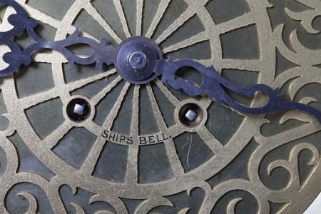 The wooden base measures approximately 20.25 across and is 8.5 inches deep. The bezel is hinged and is fitted with glass. It opens from the left, allowing one to access the 12-inch diameter dial. Special Grand dials are formatted with a fancy pierced center inset. The Retailer's name and Ships Bell are engraved on this surface. The brass Arabic hour numerals are applied at the hour positions along the close minute ring. This time ring has silver washed. The hands are steel and have been blued.